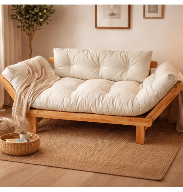 Un canapé futon convertible idéal pour les petits espaces et pauses détentes !