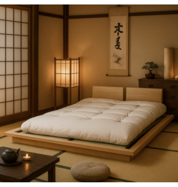 Cadre de lit en hêtre massif + sommier à lattes ou sommier à lattes + tatamis + 5 pieds
